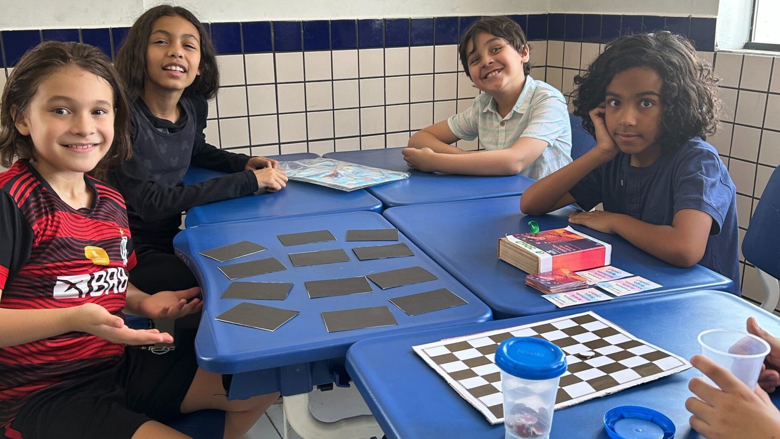 Os estudantes do 4º ano, com o apoio das famílias, criaram jogos de tabuleiro inspirados no livro “Embola, Enrola e Rola”. A proposta era desenvolver, em casa, jogos criativos que representassem elementos da história, como trilha, quiz, jogo da memória, …