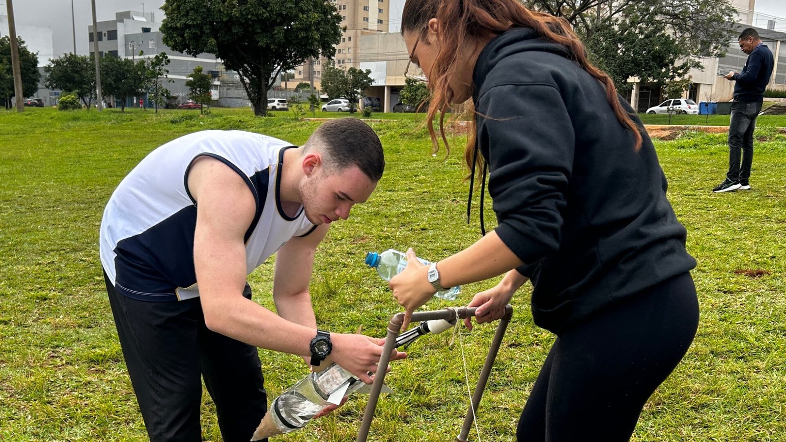Os estudantes da 3ª série do Ensino Médio participaram da atividade “Lançamento de Foguete de Garrafa PET”, orientada pelos professores Isaac José e Marcelino Pedrosa.